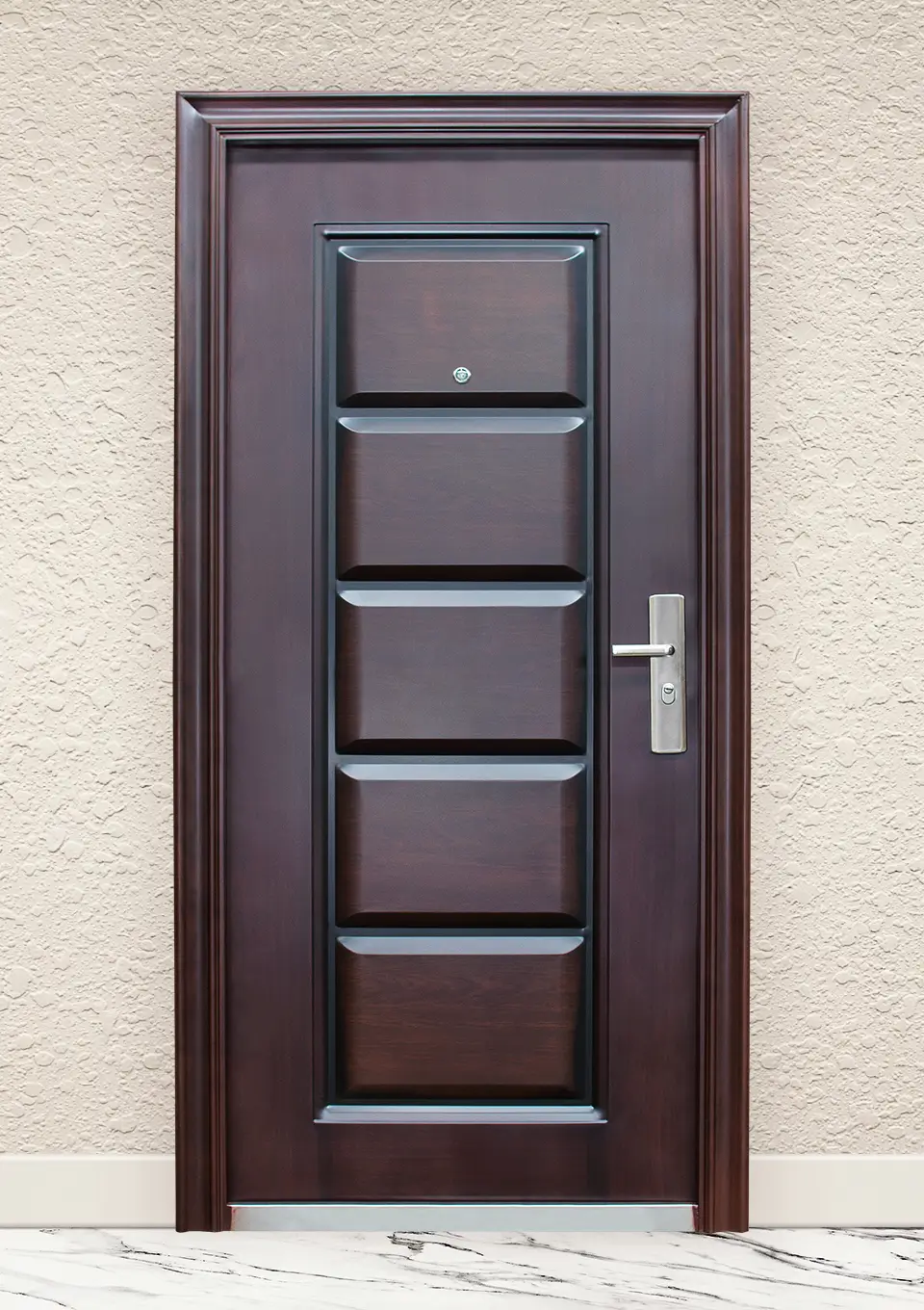 Крилото на вратата е изработено от два метални листа с релефна повърхност, допълнително оребрено с метални профили и поставена между тях изолация тип „пчелна пита”. Дебелината на крилото е 50мм, покрито с машинно поставено топло пренесено PVC фолио. Касата на вратата е метална с дебелина 90мм. Покрита е с машинно поставено топлопренесено PVC-фолио с перваз само от едната страна. Заключването е тристранно, 12-точково. Бравата заключва вратата в три посоки – нагоре, надолу и в страни с 11 шипа, като има и вътрешна ключалка с един шип.