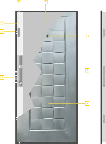 Крилото на вратата е изработено от два метални листа с релефна повърхност, допълнително оребрено с метални профили и поставена между тях изолация тип „пчелна пита” Дебелината му е 50мм. Крилото е прахово боядисано.